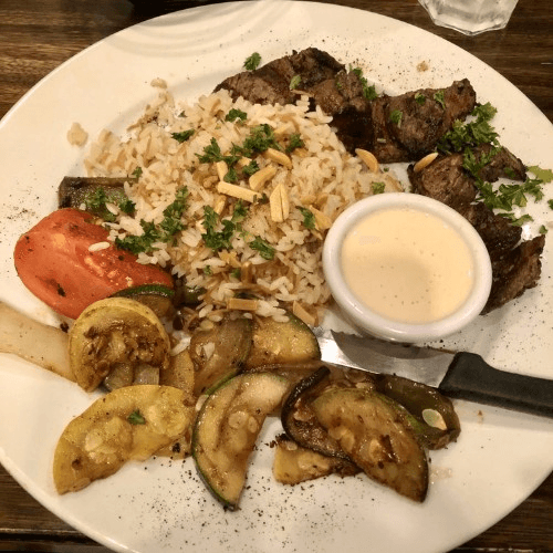 Charbroiled tender pieces of Angus beef with grilled tomatoes, green peppers, onions, pickles, turnips, sumac and tahini sauce.