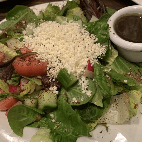 Organic mixed spring, romaine lettuce, English cucumbers, green peppers, diced tomatoes, scallions topped with grumbled feta cheese.