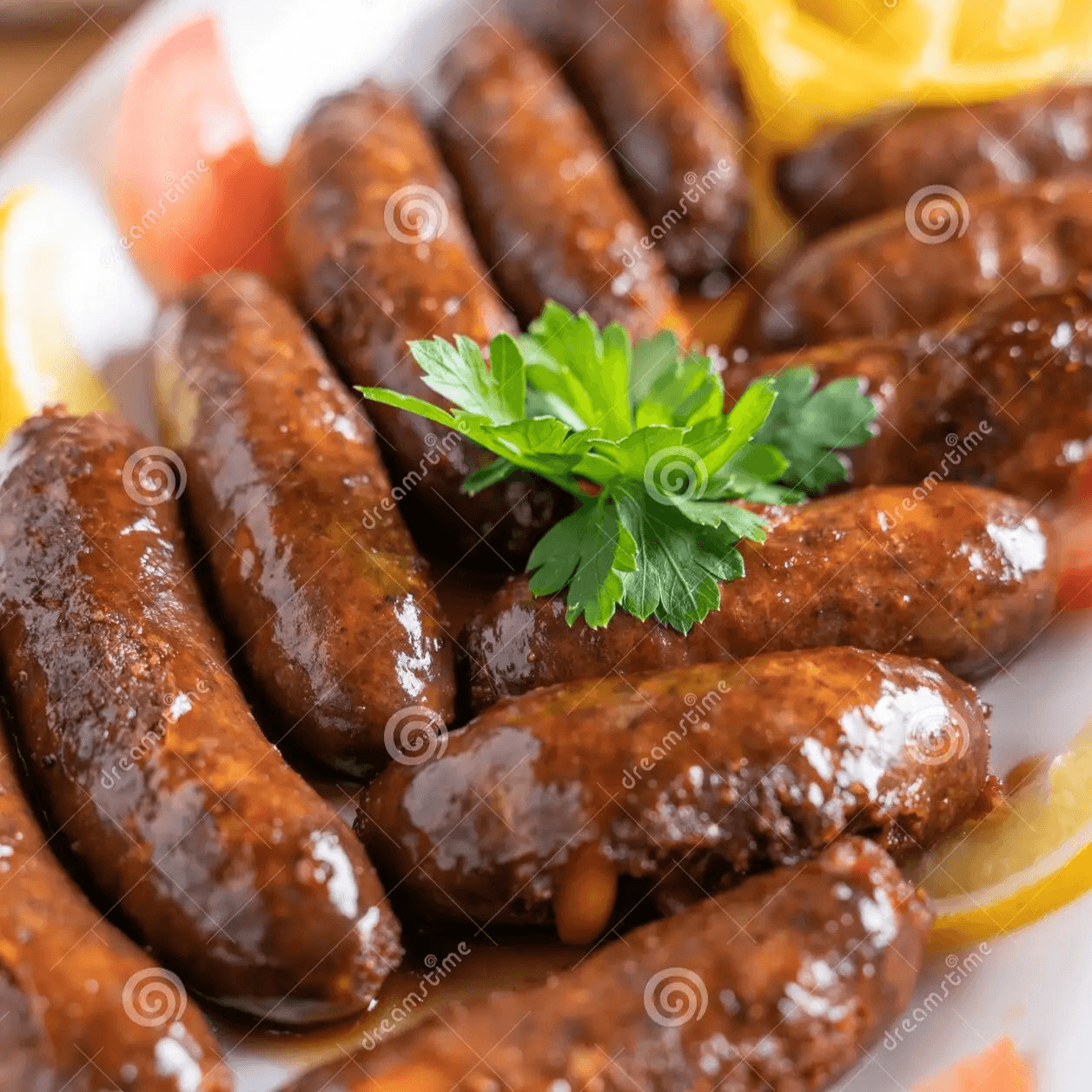 Sautéed Angus ground beef sausages with Armenian spices, grilled tomatoes, turnips and pickles.