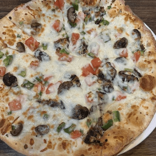 Freshly baked vegetarian pizza with a mix of thyme, sesame seeds, diced onions, tomatoes, and cucumbers; all mixed with imported extra virgin olive oil.