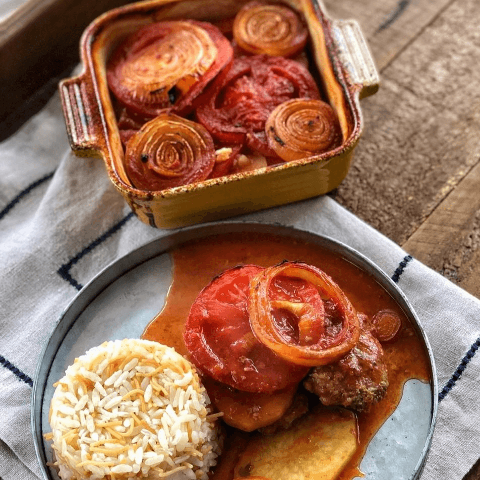 Baked kafta with tomatoes sauce and potatoes, served with rice and vermicelli topped with roasted almonds.