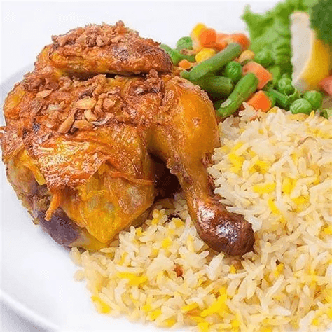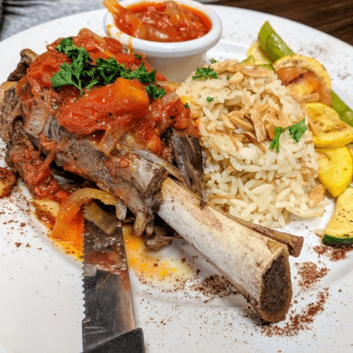 Braised bone-in lamb shank topped with savory tomatoes sauce, served with grilled mixed vegetables and your choice of white rice mixed with vermicelli topped with roasted almonds or garlic mashed potatoes or French fries.