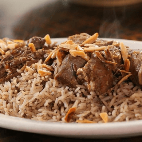 Braised leg of lamb served over a bed of a mix cooked rice and Angus ground beef with Lebanese spices topped with roasted almonds and side of yogurt.