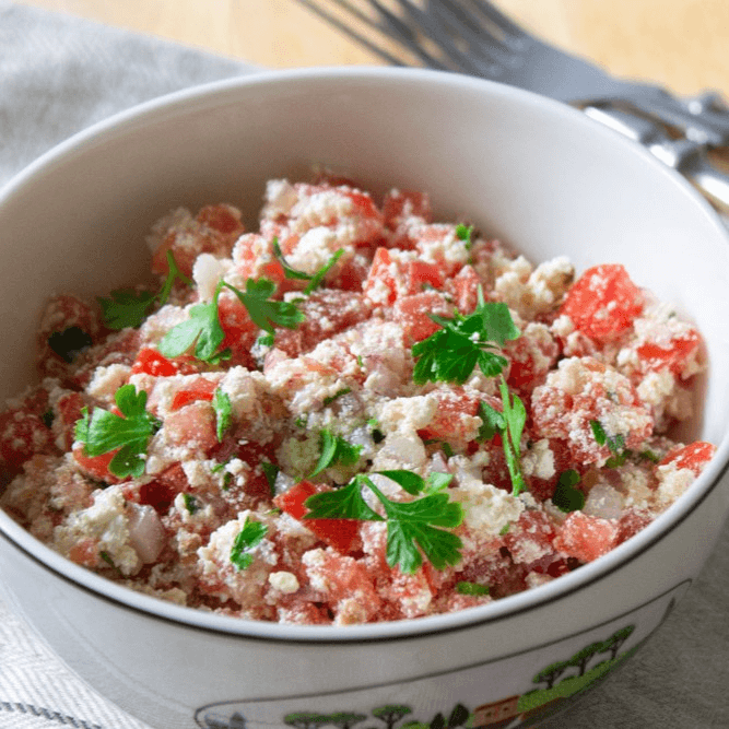 A mix of crumbled feta cheese, blue cheese, diced tomatoes, onions, chopped parsley tossed in imported extra virgin olive oil.