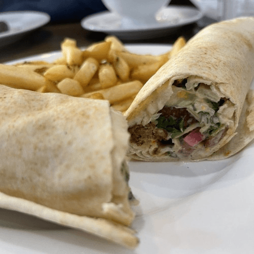 Vegetarian patties of deep fried chickpeas and fava peas with diced tomatoes, pickles, turnips and tahini sauce.