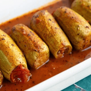 Stuffed zucchini with Angus lean ground beef mixed with rice simmered in tomatoes sauce served with grape leaves stuffed with lean ground lamb and rice.