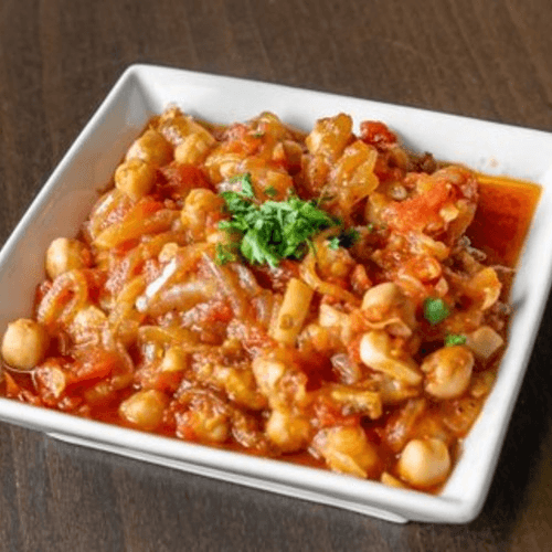 Cold or hot. Eggplant and chickpeas simmered to perfection in tomatoes sauce, garlic, onions and imported extra virgin olive oil.