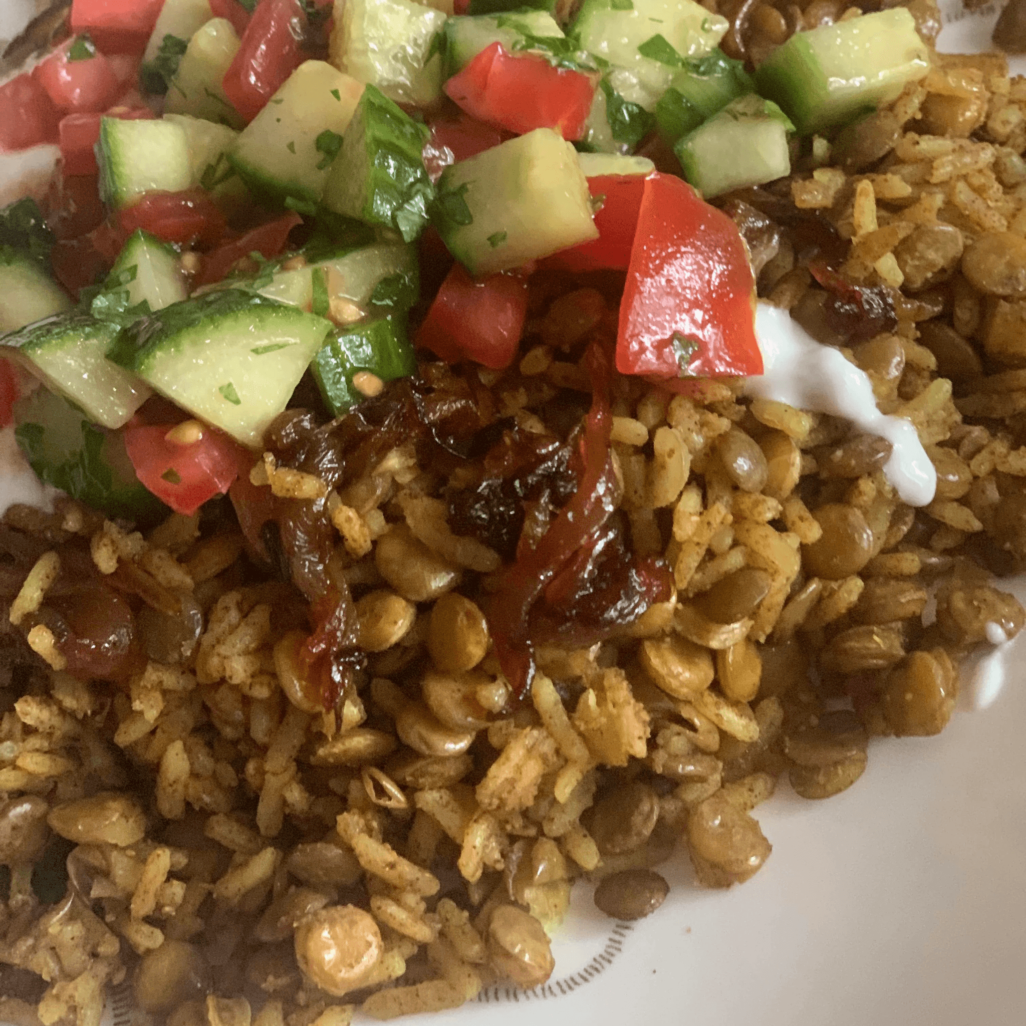 A fine mixed of rice and lentil topped with fried onions and Lebanese salad and side of yogurt.