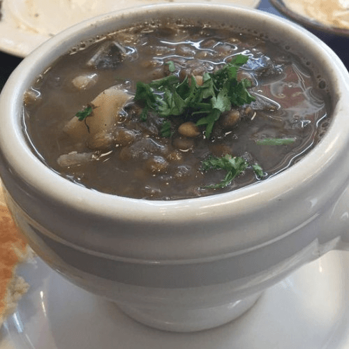 A healthy lemony combination of lentil, sautéed onions, Swiss chard and diced potatoes.