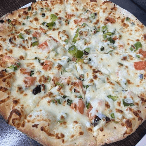 Freshly baked pizza with mozzarella and feta cheese topped with dice tomatoes, cucumbers, green peppers, scallions, radish, thyme and black olives.