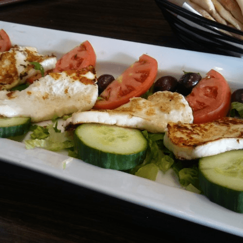 A combination of organic mixed spring with romaine lettuce, diced tomatoes, green peppers, scallions, radish, English cucumbers, mixed with byblos dressing and topped with toasted pita bread.