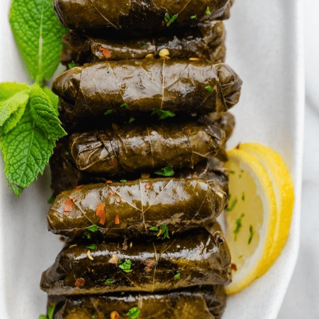 Grape leaves filled with a mix of rice, parsley, tomatoes, poached in fresh lemon juice and imported extra virgin olive oil.
