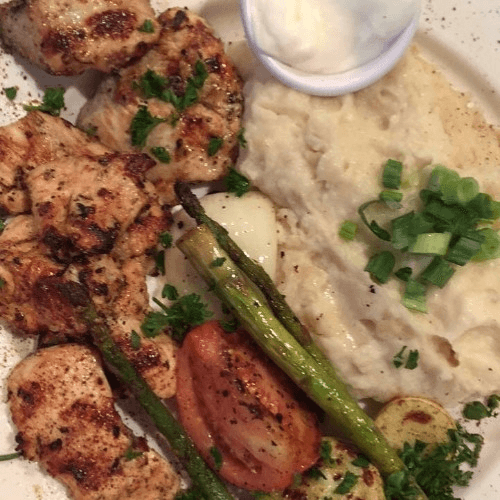 Charbroiled pieces of marinated chicken breast served with grilled vegetables and your choice of white rice mixed with vermicelli topped with roasted almonds or garlic mashed potatoes or French fries.